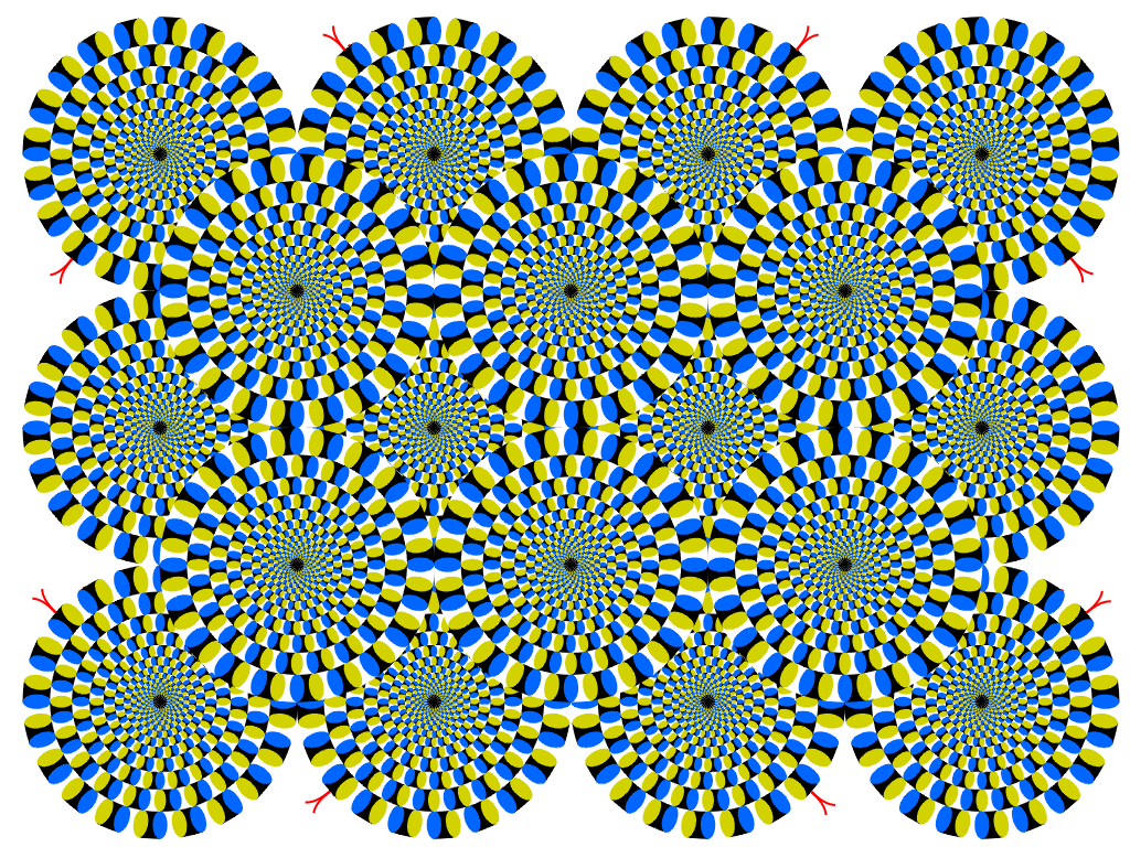 Dylech chi weld 'nadroedd' yn cylchdroi. Ond, pan fyddwch chi'n canolbwyntio ar un o'r nadroedd sy'n symud yn y llun, dylai stopio.